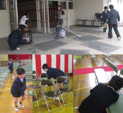 本日6限、「前日準備」。5年生と教職員が講堂に集合し役割分担。講堂内の清掃や長いすの整列・雑きんがけなど会場の再設営と、卒業生の花道になる廊下や階段の清掃などを行いました。どの子どもも真剣そのもの。最高学年に向けての覚悟が感じられました。