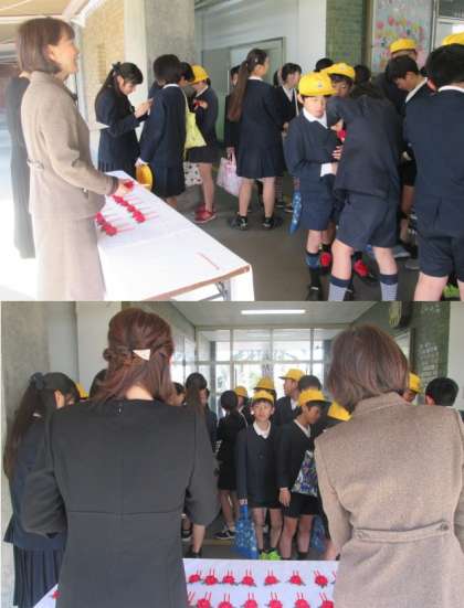 卒業生が登校してきます。いつものように、校長先生が出迎えます。