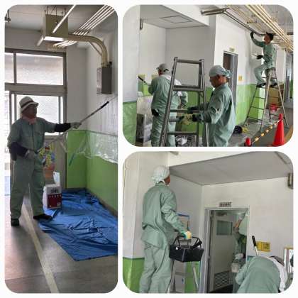 本校と他校の管理作業員が合同で、1階壁面をきれいに整備しています。