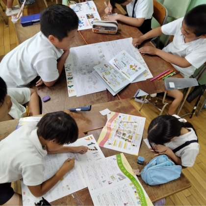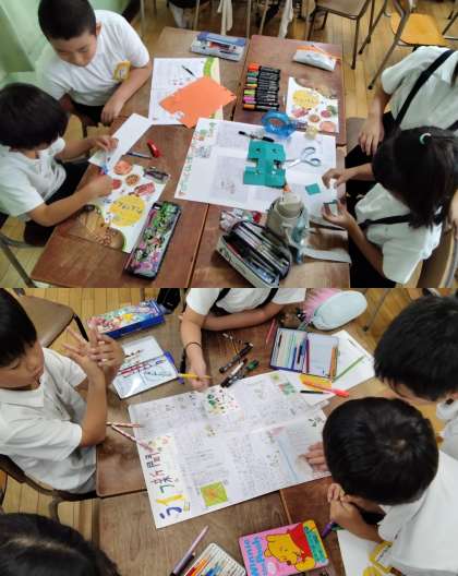 ライフ喜連瓜破店での社会見学で学んだことを、班の友達と協力して新聞にまとめています。