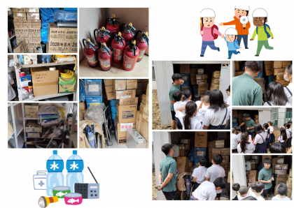 水やビスケットなどの保存食のほかに、消火器やブルーシートなど、もしもの時に備えていろいろなものが備蓄されています。