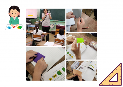 紙をおり、できた四角形の角の形を調べます。 できた角の形を『直角』といいます。