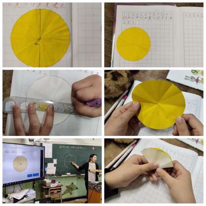 円の中心を通した線を引き、半径・直径についても確認しています。