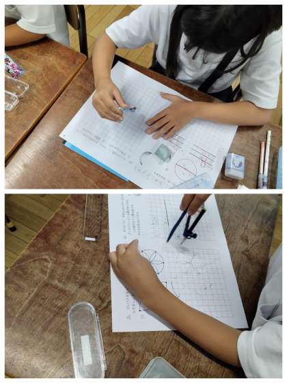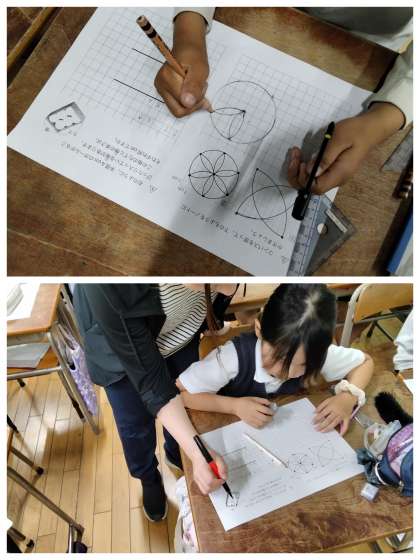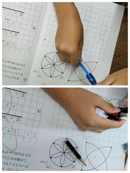コンパスを使って、いろいろな模様を描いていきます。