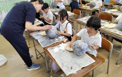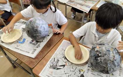 膨らませた風船に、新聞紙を小さく切ったものを糊でペタペタ貼っています。