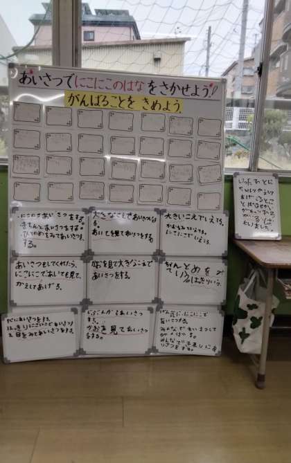 1年生が、にこにこのはなをさかせようと「あいさつ」を頑張っています。