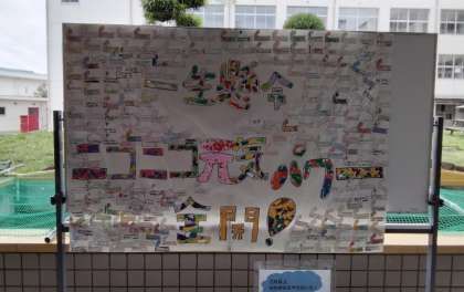職員室前の特別活動掲示板に掲示していた「運動会の旗」が、玄関前に移動しました。