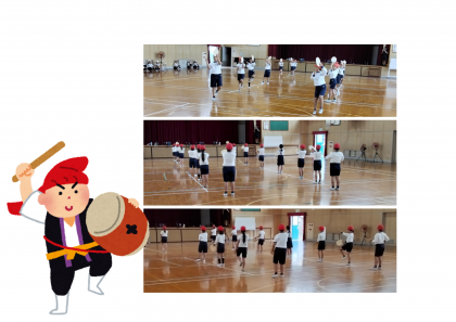 運動会で披露した『エイサー』をもう一度踊り、互いに見合っています。