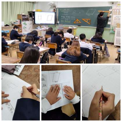 垂直や平行な直線を実際にかいたり、それらを元に形を仲間分けしたりしています。