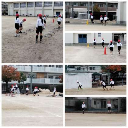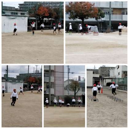 洋楽が流れる中、4年生が運動場でサーキットトレーニングに取り組んでいます。
