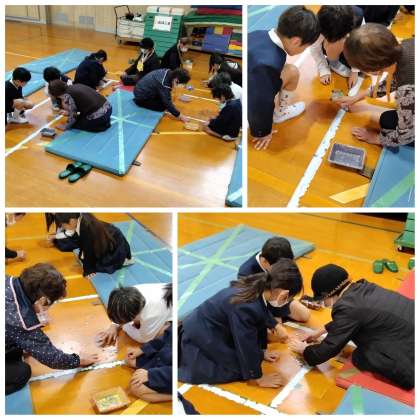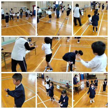 体育館で、「おはじき」や「けん玉」「こま回し」などを一緒に楽しみます。