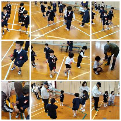 体育館で、「おはじき」や「けん玉」「こま回し」などを一緒に楽しみます。
