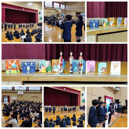 本選出場者が舞台前に並び、図書委員から低・中・高学年の上位3名の名前が呼ばれました。