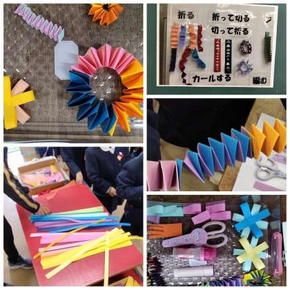 自分の好きな色の紙を選び、切ったり折ったりして素敵な飾りを作っています。