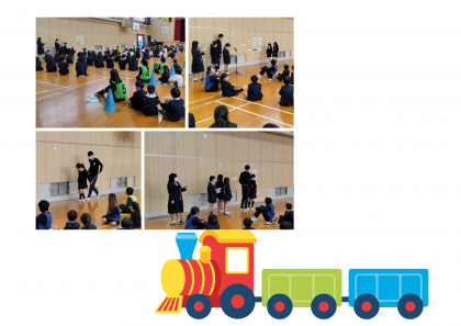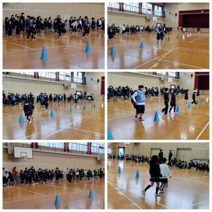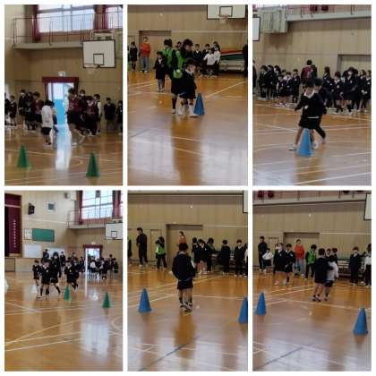 二人組になり、紙テープで汽車をつくり三角コーンを回ってきます。