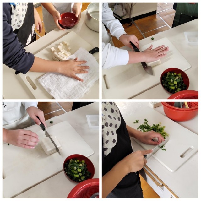 豆腐を切るときは、崩さないように慎重に包丁を扱う姿が見られました。