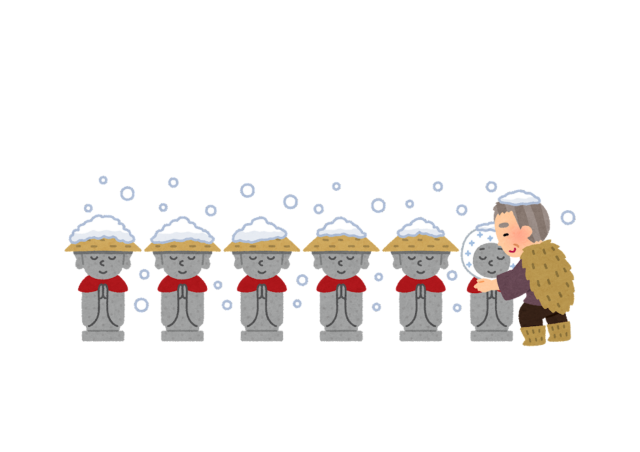 貧しいおじいさんが、お正月に売れ残った笠を雪の降るお地蔵様にかぶせてあげたら、お地蔵さまがお礼に宝物やごちそうを届けてくれた、心温まるお話です。