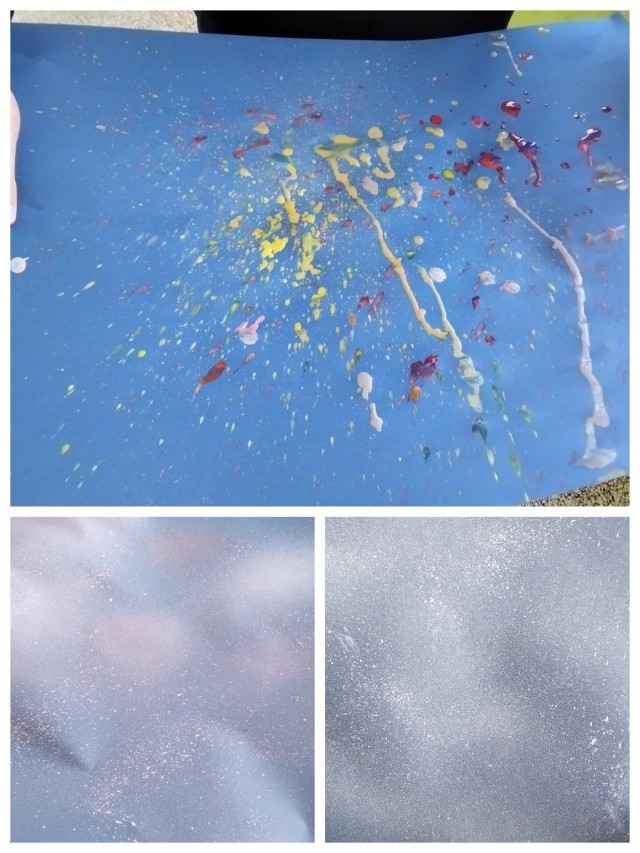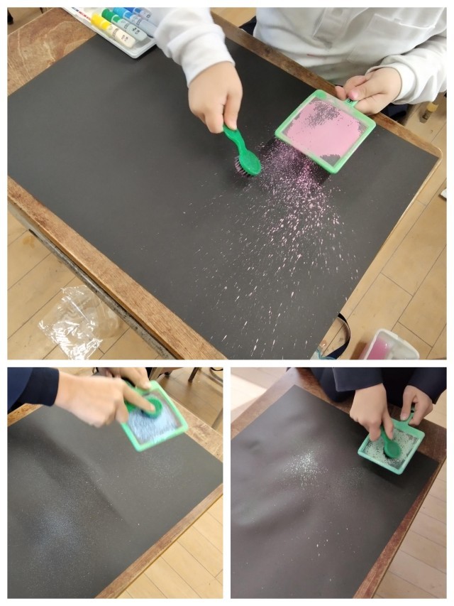 画用紙を切ったり折ったりして制作している「雪の結晶」をより輝かせるための背景に取り掛かっています。