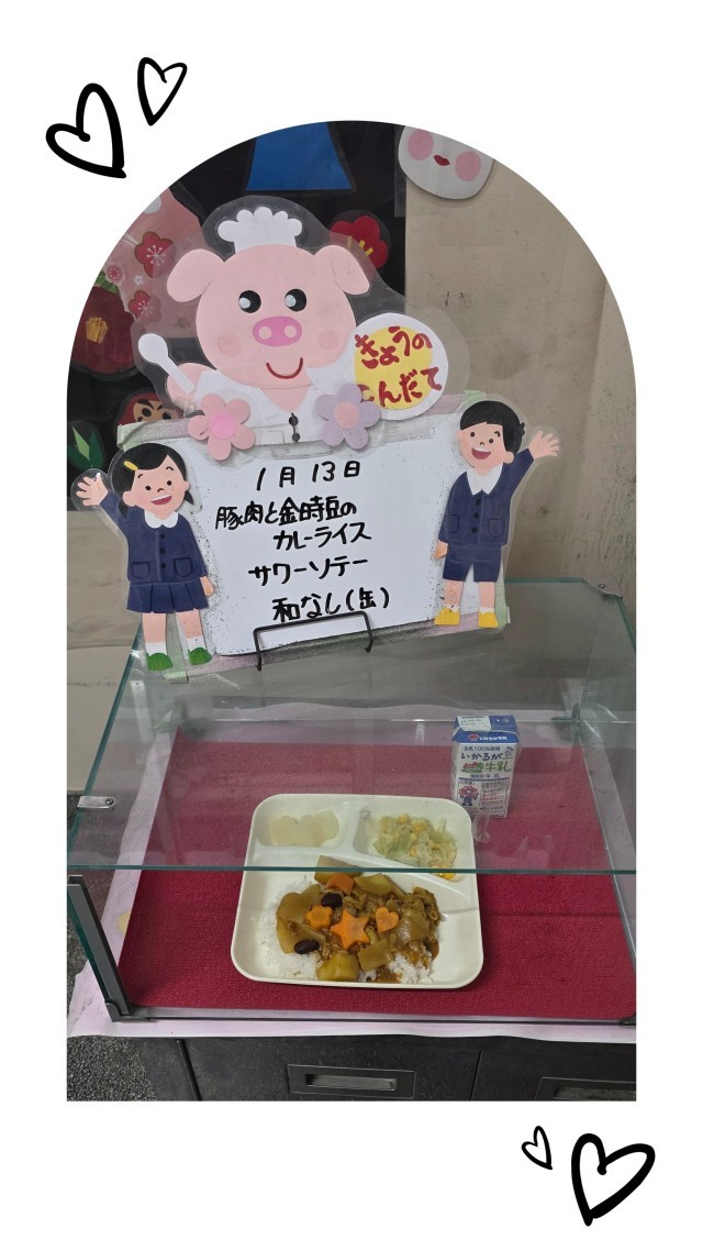 配膳されたカレーライスに、ラッキーにんじんを見つけると思わず笑顔になっています(*'▽')