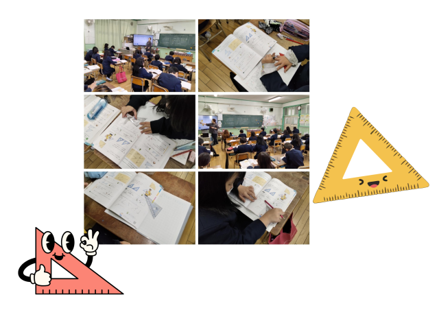 三角定規を使って、教科書にある角の大きさを比べています。