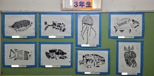 色々な素材を使って、自分の釣りたい魚類を版画で表現しました。