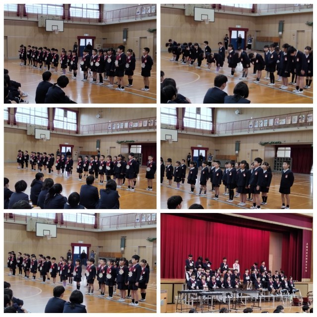 全校児童での校歌合唱で始まった会は、全校児童での合唱「音楽のおくりもの」(2番はオリジナルの歌詞で6年生を主役にしたものになっています。)