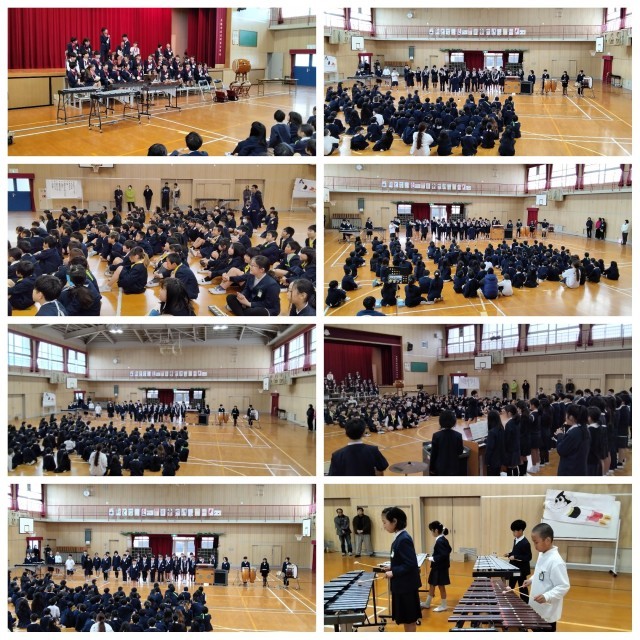 6年生 歌「ぼくらの日々」、合奏「饗宴~まつり~」、手縫い雑巾のプレゼント
