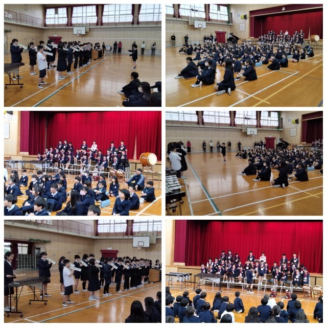 全校児童での校歌合唱で始まった会は、全校児童での合唱「音楽のおくりもの」(2番はオリジナルの歌詞で6年生を主役にしたものになっています。)