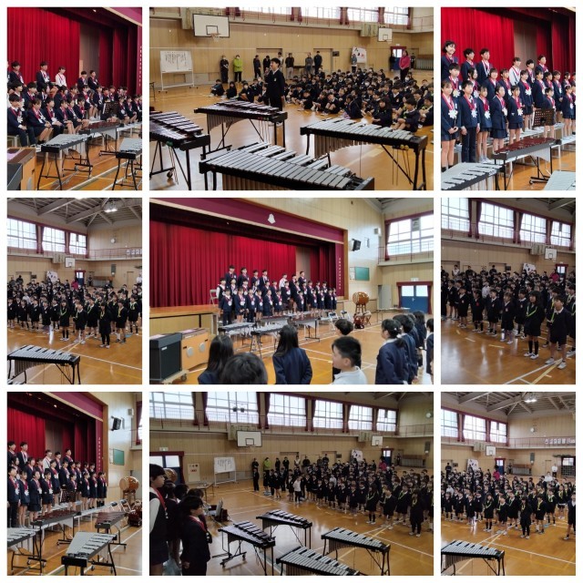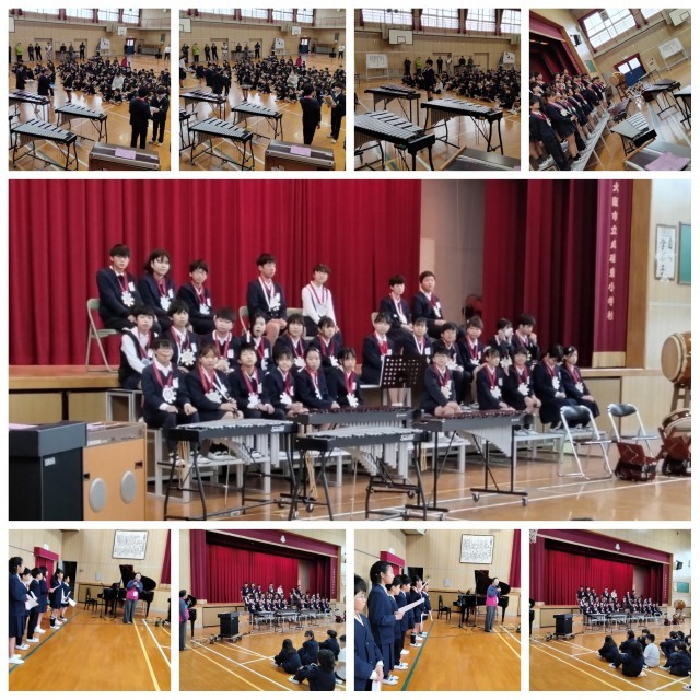 6年生 歌「ぼくらの日々」、合奏「饗宴~まつり~」、手縫い雑巾のプレゼント