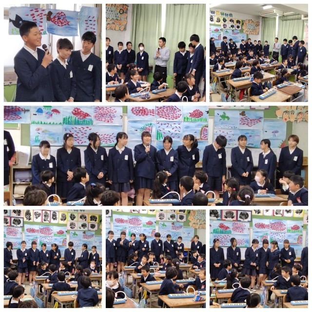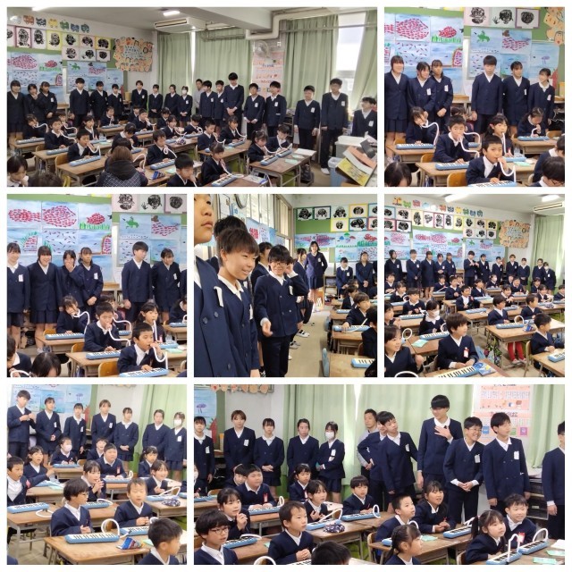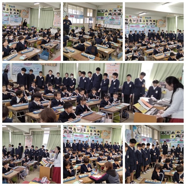 1年生は、ベートーヴェンの『交響曲第9番』第4楽章で歌われる「よろこびの歌」の一部を鍵盤ハーモニカで演奏したり、ドイツ語で歌ったりしています。明日卒業する6年生に、お祝いの気持ちを込めて音楽の贈り物として聴いてもらいました。