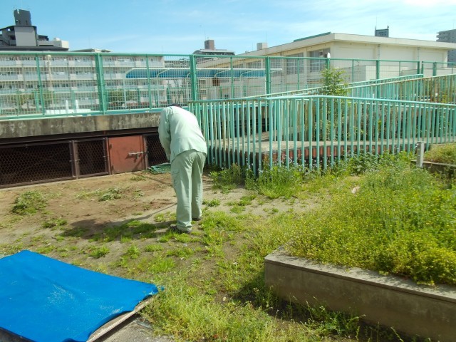 うりひがっこのみなさんが、毎日安全に学校生活を過ごすことができるように、管理作業員さんが中庭の手入れをしていました。