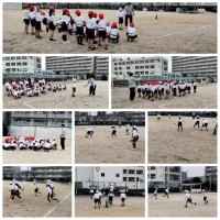 【タグラグビー】の挑戦です!先生が説明するルールをよく聞き、ゲームを楽しんでます...