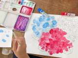 4年生の図工では、紫陽花の絵に色をつけています。 水の多さで濃淡をつける工夫が...