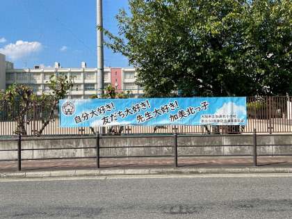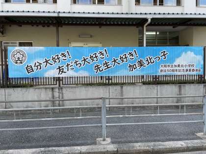 創立50周年記念横断幕を作成しました。 学校の校訓がのせられています。