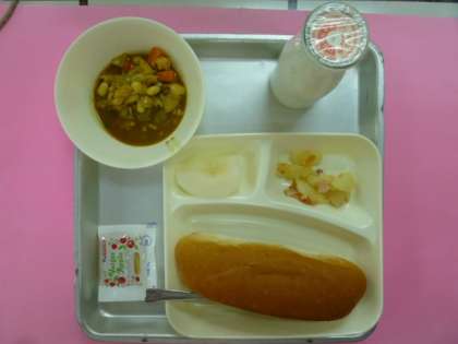 今日の献立は、コッペパン、りんごのジャム、鶏肉とてぼまめのカレー煮、じゃがいもとトマトの重ね焼き、なし(二十世紀)、牛乳です。