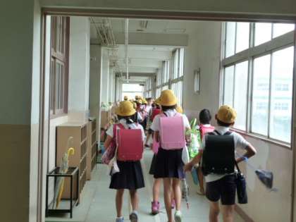 6年生が1年生を教室に迎えに行き、地域別の教室に集まりました。