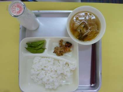 今日の献立は、ご飯、鶏肉のねぎ焼、ソーキ汁、枝豆、牛乳です。