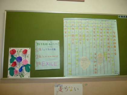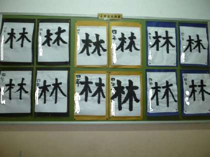 4年生の毛筆「林」、広報委員会の掲示です。広報委員会は、月の行事予定とともに、アンケートの結果や季節の飾りを掲示しています。