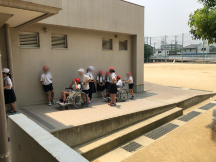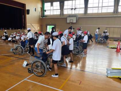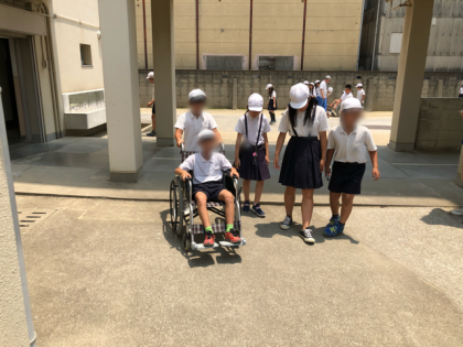 5年生は車いすの体験をしました。実際に車いすを操作したり、友達が乗る車いすを押したりしました。体験を通して、人に対する優しさや思いやりの大切さを学びました。