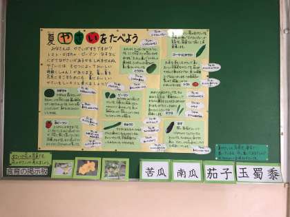 ピーマン・かぼちゃ・きゅうり・オクラなど夏はおいしい野菜がたくさん採れます。また、夏野菜は身体の調子を整えてくれます。詳しくは職員室の横に掲示しています。