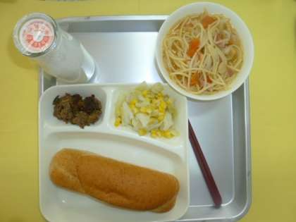 今日の献立は、ライむぎパン、牛肉のカレー風味焼き、トマトのスープスパゲッティ、キャベツとコーンのピクルス、牛乳です。