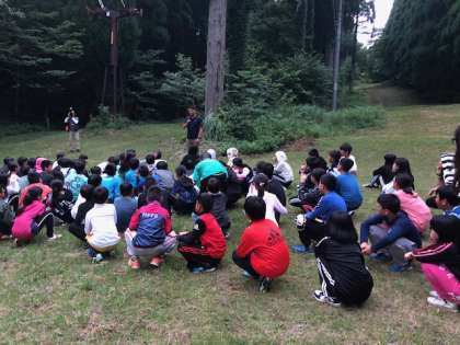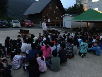 ナイトハイクをしました。夕暮れを迎えた薄暗い森の中を左側にあるロープを頼りに歩きました。ヒグラシの鳴き声や枯れ枝を踏みしめる音など都会では気づくことができないいろいろな感覚を楽しみました。本当に素晴らしい体験ができました。