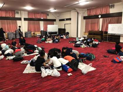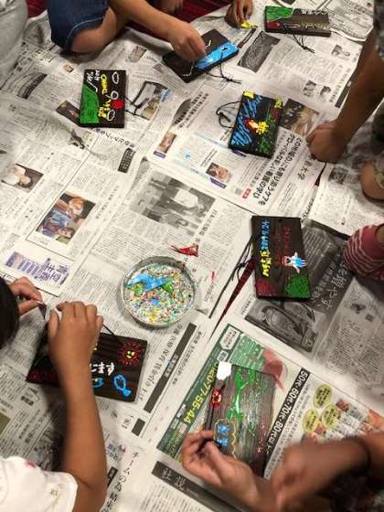 焼き板作り。林間の思い出として焼き板を作りました。筆を使わずにペイントするのが難しそうでした。突然の通り雨で室内での活動になりました。