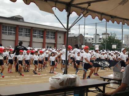 天候が悪いと予想された運動会でしたが、開会式と団体演技を行いました。児童の健康と安全を考え、雨が降ってきたら中断しすぐに教室に入れようと椅子を使わずシートを使用しました。一番時間をかけた団体演技に絞って、プログラムを組み替えました。