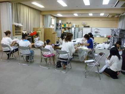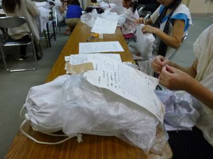 PTA保健・給食委員会の方を中心に、子ども達の給食エプロンの修理がありました。子ども達が毎日使っている給食エプロンも、ゴムがのびたり、ボタンが取れたり、修理が必要になってきます。毎年、この時期にPTAの方に協力していただいて修理をしています。