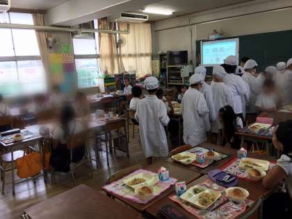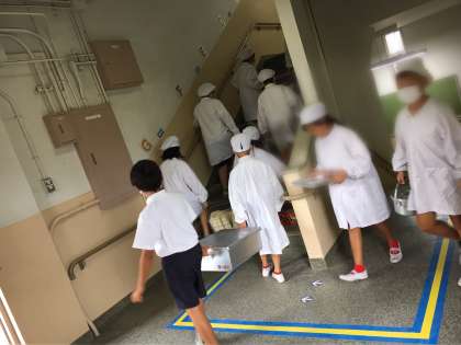 今日から給食が始まりました。今日の献立は和風焼きそば・きゅうりのゆず風味・1/2パン・牛乳です。