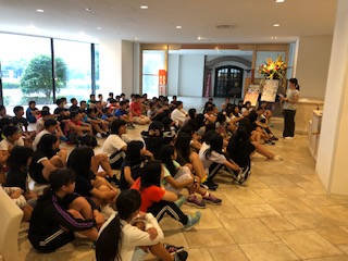 全員が元気に2日目を迎えました。天気は小雨模様。ロビーで朝の集いをしました。