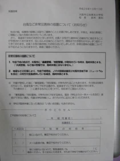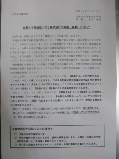 本日、全児童に「台風など非常災害時の措置について(お知らせ)」と6年児童に「台風19号接近に伴う修学旅行の実施(延期)について」のお手紙を配布しています。必ずご確認ください。