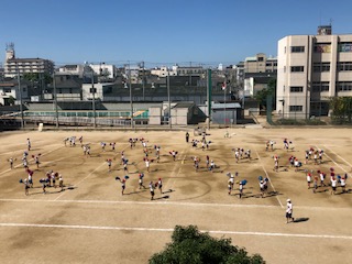 快晴の下、団体演技のダンスを夢中になって踊っています。