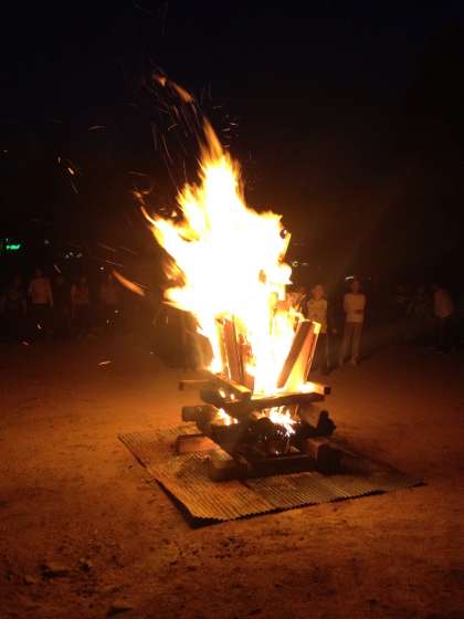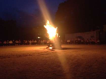 キャンプファイヤーは炎を灯してから、どんどん炎を大きくしようと、大きな声で掛け合い合戦をしました。最終的にとても大きくパチパチと音の鳴るキャンプファイヤーが体験できました。